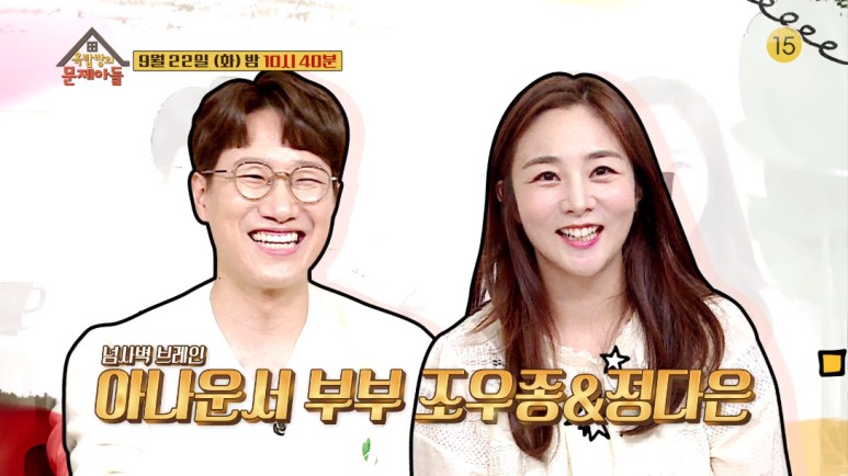 조우종 76년생 45세, 정 대은 83년생 38세, 두 분은 7살 차이가 납니다.조우정 학력 한국외국어대학교 글로벌캠퍼스 이탈리아어 통번역학 과정 다운학력 서울대학교 언론정보학 학사입니다.22일 방송되는 옥탑방 문제아에서 이날 조우정 정다운 부부는 첫 예능 출연을 밝히며 방송에 함께 나오는 게 어색하다고 밝혀 눈길을 끌었다. 조우종은 풀메이크업한 아내의 모습이 낯설다며 딴 사람 같다고 말해 웃음을 자아냈습니다.