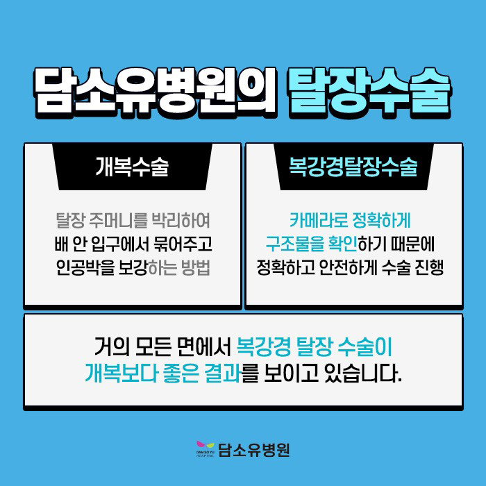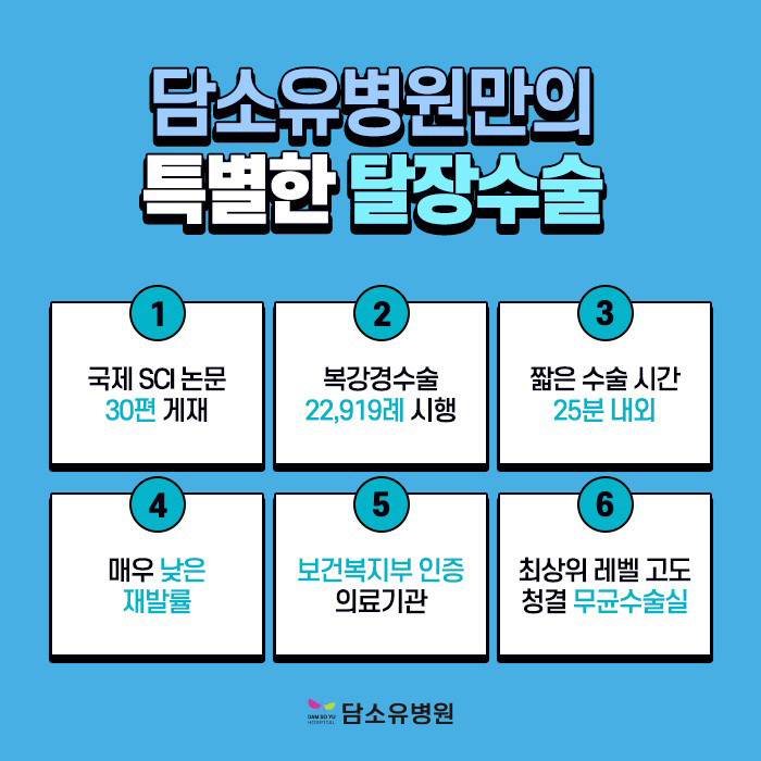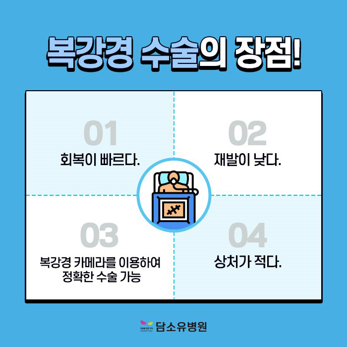 담소유병원에서 시행하고 있는 복강경 방법은 다른 방법에 비해 통증이 적고 감염위험이 적으므로 회복기간이 짧아진다는 장점을 가지고 있습니다. 해당 질환에 대한 진료가 15000례에 달하는 것처럼 많은 분들에게 완화되고 있는 곳은 결과적으로 0.1%이하의 재발률로 문제가 거의 발생하지 않도록 진행하고 있습니다.