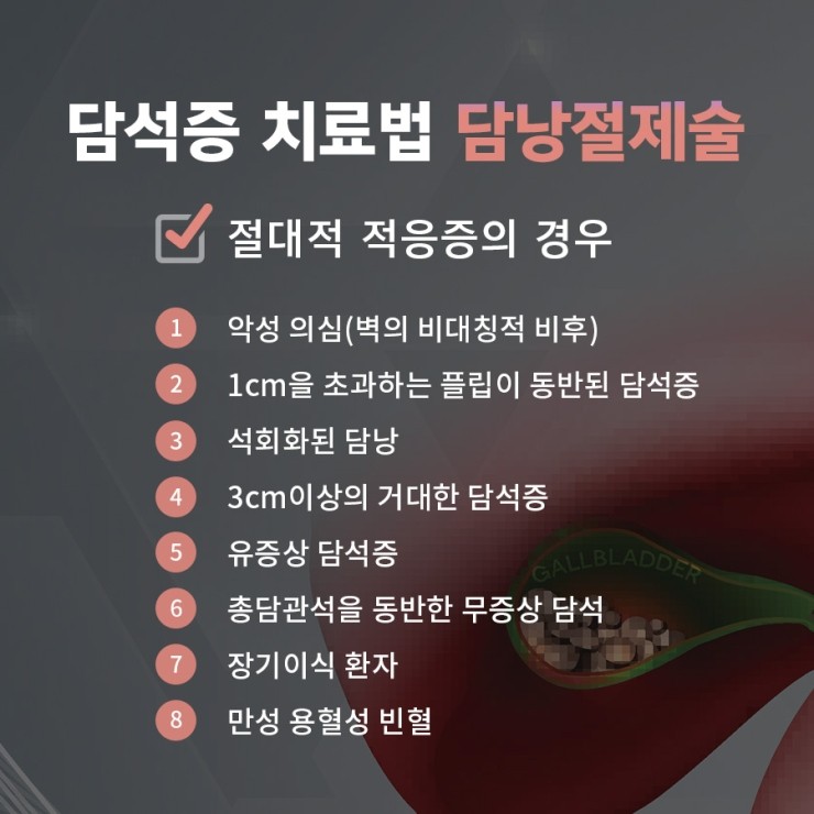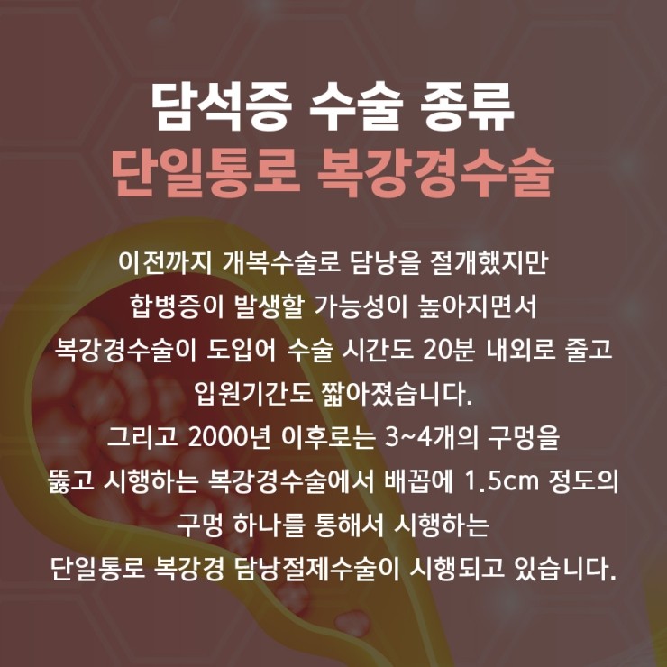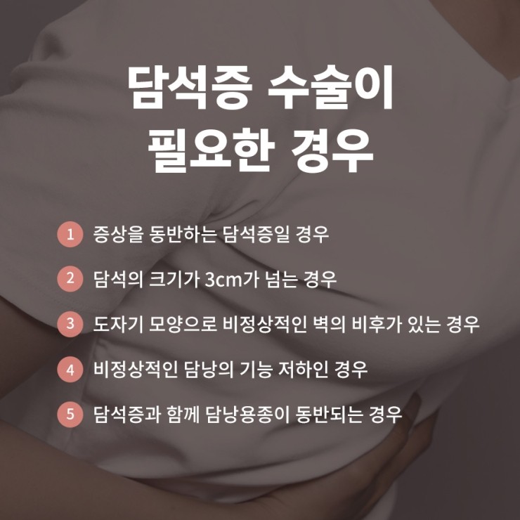 그래도 수술이 부담스럽다고 하시는 분들은 부작용이나 통증 등 불편함을 줄일 수 있는 방법을 알아주셨으면 하는데. 최근의 수술은 이전과는 달리 거의 모든 병원에서 복강경으로 이루어지고 있다고 합니다.수술 시간도 20 분 전후로, 입원 기간도 3 일로 매우 짧아졌습니다.흉터도 배꼽 아래 1.5cm 정도로 딱 하나 남는다고 했어요. 담낭은 소화를 돕는 주요 기관인데 제거하지 않고 그대로 두면 다른 질병으로 인해 건강을 해칠 수 있기 때문에 병원에서도 대부분 외과적 치료를 권유했습니다.