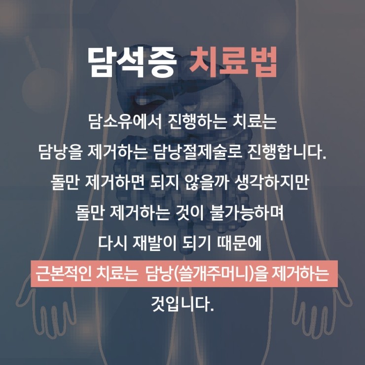 이러한 담석증의 증상이 나타나면 담낭염이나 담관염을 동반할 가능성이 높아져 주의가 필요한 것이군요.증상에 맞는 치료를 통해 호전될 수 있어요시간이 지날수록 저절로 좋아지는 병변이 아니었어요. 따라서 무증상을 느끼면 즉시 전문병원을 방문하여 담석증을 치료하는 것이 확실한 방법입니다.크기가 2cm 이상인 담석증과 1cm 이상인 담낭용종이 동반되는 경우 중증의 경우 암으로 이어질 수 있으므로 조기진단과 신속한 개선이 필요합니다.