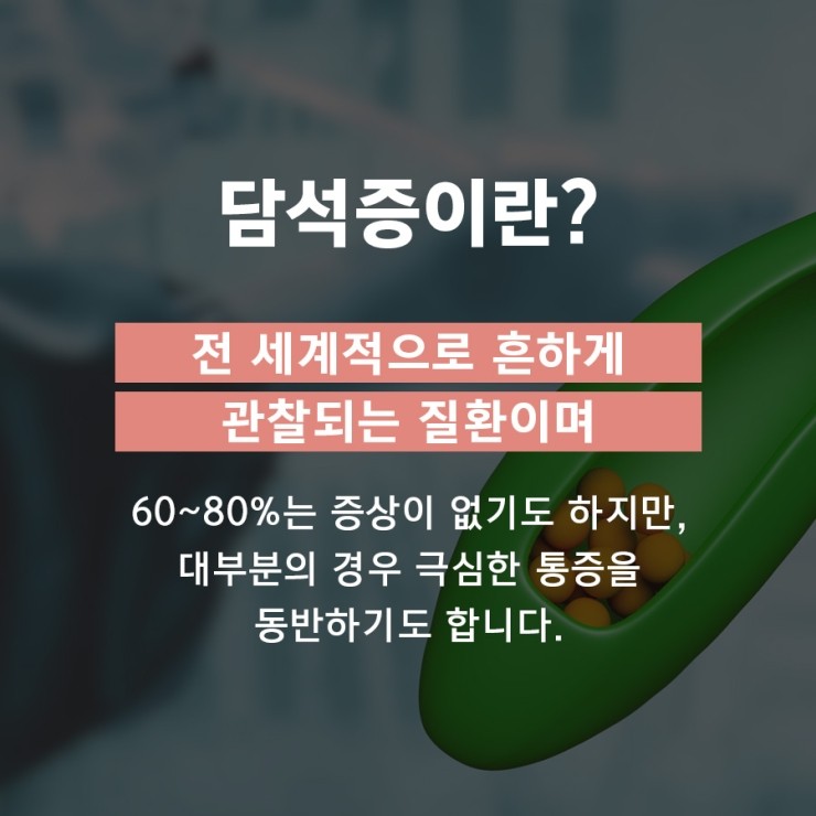 새해를 맞이해서 다이어트 계획을 세우시는 분들이 많이 계실 거예요몸매관리도 물론 중요하지만 요즘엔 무리한 다이어트를 자주 하는 젊은이들이 복통을 호소할 때가 많다고 합니다.이럴 때는 담석증을 의심해봐야 할 것 같아요.다이어트 때문만이 아니라 제대로 된 식단과 규칙적인 생활습관을 실천하지 못하는 현대인에게 특히 발병한다고 했습니다.기름지고 자극적인 식습관에 특히 취약합니다.담낭 속에 콜레스테롤이 쌓이게 되면 담석이 생기게 되는 원인이 됩니다.그래서 그런지 전 세계적으로 자주 발병하는 질환이래요.