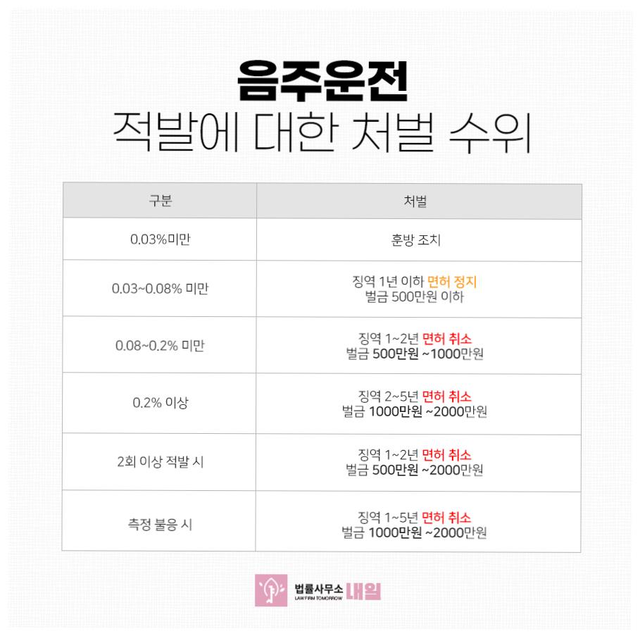 예전에는 혈중 알코올 농도 0.05% 미만의 경우 일반적으로 훈방 처치가 이루어지고 있었기 때문에 법률적 책임을 지는 일은 극히 드물었다고 알려져 있습니다. 다만, 현재는 혈중알코올농도가 0.03%이상에 해당하는 때부터 처벌면허에 대한 행정처분의 대상으로 유의해야 하지만,