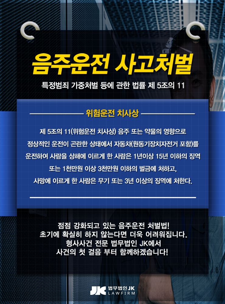 이처럼 음주운전으로 인한 상해, 사망 사건은 이 사회에서 끊임없이 발생하고 있는데 이번 글에서는 음주운전 상해, 사망 사건에 대해 알아보도록 하겠습니다. 음주운전에 의해 상해나 사망자를 발생시켰을 경우에 대해서, 특정범죄가중처벌등에 관한 법률이 법률에 의해 규율을 정하고 있습니다. 재5조의11 위험운전 등 치사상에 있어서 음주 또는 약물의 영향으로 정상적인 운전이 곤란한 상태에서 원동기장치자전거를 포함한 자동차를 운전하여 사람을 상해한 사람은 1년 이상 15년 이하의 징역 또는 3천만원 이상 3천만원 이하의 벌금에 처해집니다. 그리고 사망에 이르게 한 경우에는 무기 또는 3년 이상의 징역에 처한다고 명기되어 있습니다. 위험운전치사상죄는 사고발생 가능성이 높은 음주운전을 고의로 행하여 과실로 중한 결과인 치상 또는 치사의 결과가 발생하였으므로 결과적 가중범입니다.