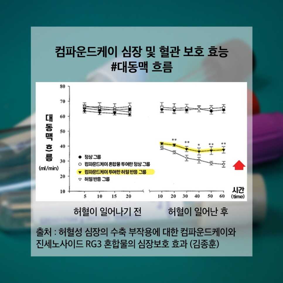 마지막으로 관류압 실험입니다.동맥에서 모세 혈관으로 보내지는 혈액의 압력을 말씀하시는 건데요.이 역시 컴파운드 케이가 투여된 그룹이 압도적으로 상승하는 것을 나타내고 있습니다.