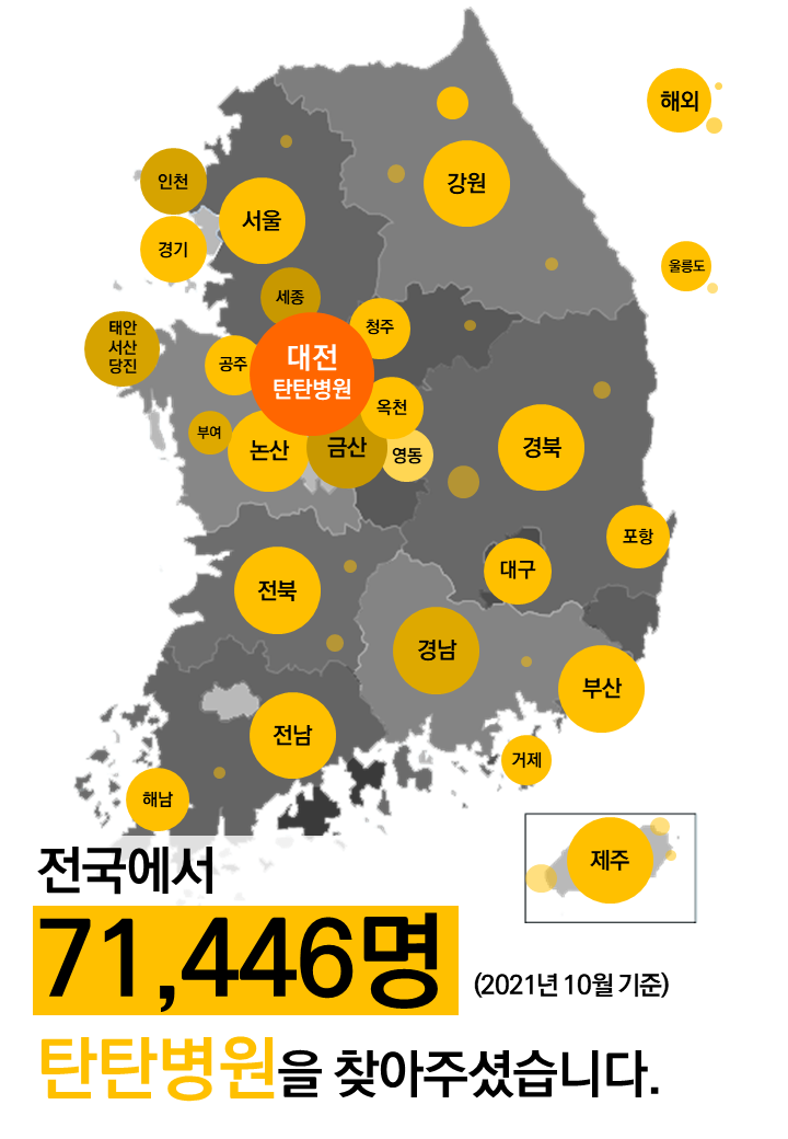 2021년 10월 현재 전국에서 어깨 통증을 앓고 있는 71,446명의 많은 환자분께서 탕탕병원을 찾아주셨습니다.