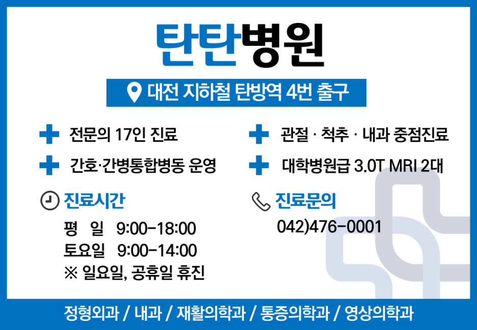안녕하세요 관절, 척추, 내과를 중점적으로 진료하고 있는 탄탄병원입니다.