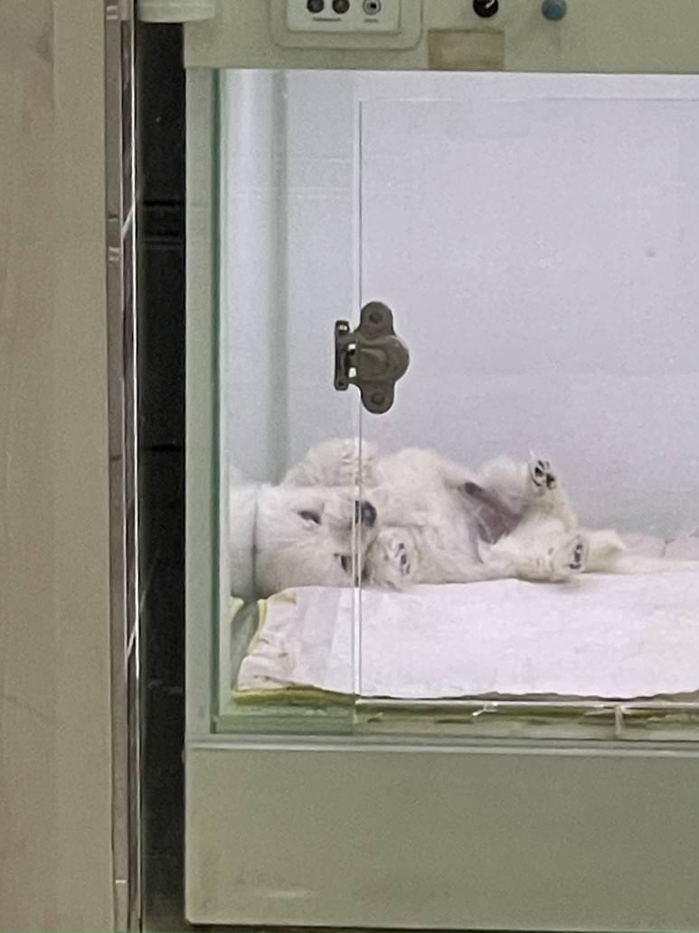 집에 돌아온 다음날 일요일 아침에도 사료를 거부하고 설사를 하고 심지어는 응아 자세를 취해 힘을 주어도 응아가 나오지 않아 불편해 했습니다. 강아지를 처음 키워보는 우리도 뭔가 느낌이 이상해서 동물병원에 전화를 해보면 강아지가 24시간 이상 먹지 않으면 저혈당으로 위험해질 수 있다며 빨리 병원에 데려오라고 합니다.오전 11시경 병원에 도착하자마자 혈액검사(역시 저혈당 TT)에 수액을 맞고 엑스레이를 찍어도 원인을 찾을 수 없고, 조영제까지 사용하여 오후부터는 시간마다 엑스레이를 찍고, 결국 일요일에는 오프인 원장까지 늦은 저녁에 병원에 출근하여 초음파까지 확인한 후 역시 탈장된 부위에 문제가 있다는 사실을 확인하게 됩니다.