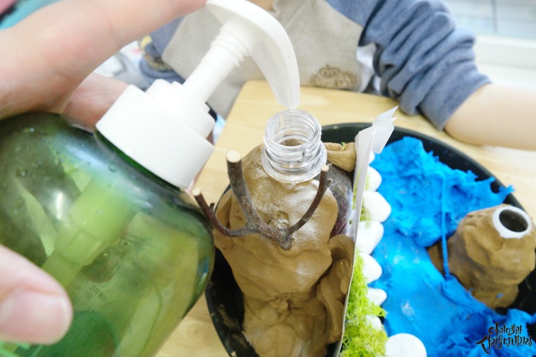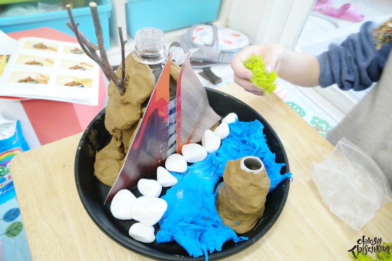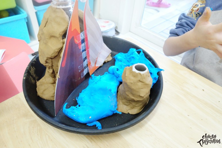 산 사이로 보글보글 올라오는 모습을 관찰하면서 마그마가 땅을 뚫고 이렇게 흘러나온대! 그러자 아이가 정말 재미있게 놀면서 과학활동을 하더라구요.