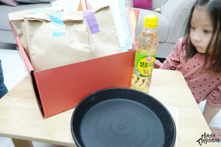 한쪽에서는 ‘식초 집에 있는 거 써도 되는데’라고 생각했는데요, 정말 아이가 너무 적극적으로 즐겁게 지내서 식초 한 통 다 쓸 정도로 즐거운 시간이었습니다.