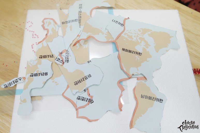 토막토막 자른 땅을 보면서 한국도 보고 참고 활동지 보면서 토막토막 맞추기도 하고