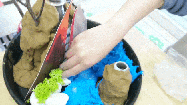 화산과 해저 화산이 있는 작은 세계를 만드는 즐거운 미술 시간도 되고 화산도 폭발하는 과학 실험도 할 수 있는 키트입니다.