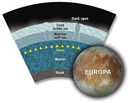 실제로 예전에는 안에 얼음이 꽉 차 있는 위 모델이 주류였지만 지금은 격동적인 에우로파의 지각변동을 볼 때 아래일 가능성이 매우 높다는 것이다.