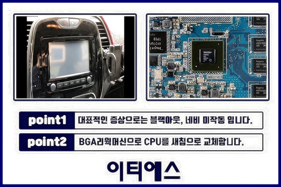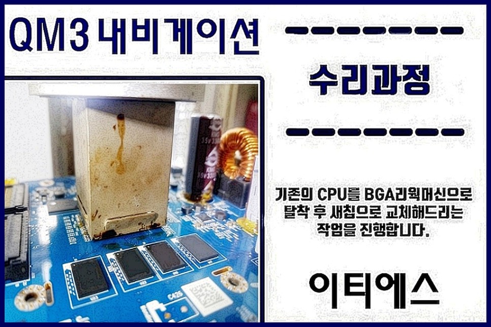 참고 : 블랙아웃은 CPU 냉장현상에서도 발생할 수 있는 증상으로 리히팅(재가열) 또는 CPU 리볼링(REBALLING) 작업 후 리볼된 CPU를 다시 구현하지 않습니다.QM3 내비게이션 수리 접수 방법