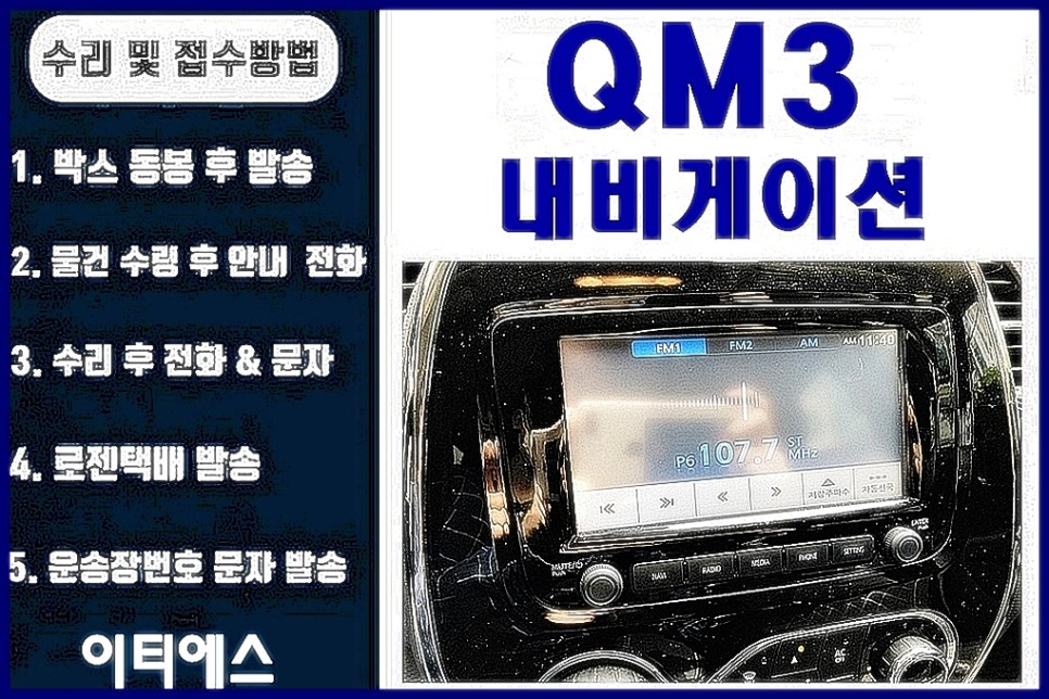 QM3 내비게이션의 수리 절차는 상기 이미지에 기재되어 있는 절차로 이루어지는데, 이는 택배를 통해 수리를 의뢰하신 경우로 수리 기간은 상품을 수령한 후 하루 정도 소요됩니다. 수리가 완료된 내비게이션은 4가지 테스트(라디오, DBM, 네비게이션, 블루투스) 작업을 수행한 후 아무 이상이 없을 경우 고객에게 결과를 보고 후 출고됩니다. 단, 주 5일제로 운영되고 있어 금요일 또는 휴일 전날 수령시 작업이 조금 지연될 수 있습니다.