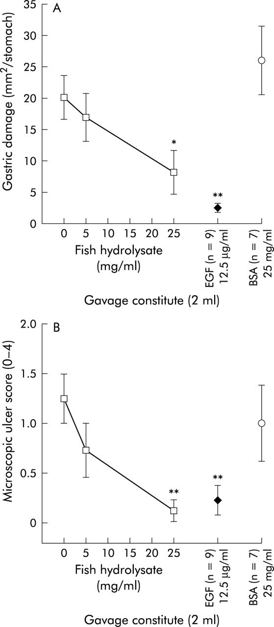 어류 단백질 가수분해물이 위 손상에 미치는 영향. 쥐를 대조군 용액(0.2mg/ml 우혈청알부민(BSA)을 포함한 식염수) 2㎖와 5mg/ml 및 25mg/ml의 어류 가수분해물 또는 12.5μg/ml의 표피성장인자(EGF, 양성대조군)로 위관영양법을 시행했다. 추가 그룹은 어류 가수분해물의 비특이적 효과로부터 특이성을 결정하기 위해 25 mg/ml의 BSA를 투여받았다. 레트에 인도메타신(20mg/kg 피하 투여)을 주사해 구속 케이지에 넣었다. 3시간 뒤 동물을 사멸시키고 거시적(A) 및 현미경적(B) 정도를 판정했다. 데이터는 그룹당 n=7~12의 평균(SEM)으로 나타냈다. *어류 가수분해물, EGF 또는 BSA가 제공되지 않은 대조군 동물에 비해 p<0.05, **p<0.01. 연구 D: 어류 단백질 가수분해물 내 활성성분 조사 어류 단백질 가수분해물의 에탄올 추출이 세포이동에 미치는 영향. 전염성이 있는 영향에 의해 결정된 대다수의 생물학적 활성은 에탄올에 용해되었다. 전형적인 결과는 그림 4에 나타나 있다. 다양한 연구 결과에 따르면 절대 에탄올로 3시간 동안 어류 가수분해물을 항온 처리하면 약 73%의 활성이 에탄올 위로 이동한다(데이터에는 표시되지 않음). 그림 4