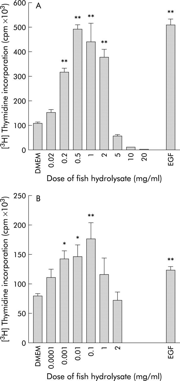 다양한 양의 어류 가수분해물과 항온처리한 후 HT29(A) 및 RIE-1(B) 세포의 증식반응. 증식은 [3H] 티미딘 이입반응을 이용하여 평가하였다. 데이터는 평균(SEM)으로 나타났다; 대조웰(Dulbecco’s modified Eagle medium(DMEM) 배지에서만 배양됨)에서 발견된 값과 비교하여 *p<0.05, **p<0.01. 두 세포주 모두 전형적인 ‘세로형’ 용량 반응이 나타났다. 표피성장인자(EGF)를 10μg/ml로 배양한 추가 세포를 양성 대조군으로 사용했다. 상처 복구 모델로의 세포 이동 HT29 세포에 어류 파우더를 첨가하자 세포 이동에 유의한 용량 의존적 증가가 나타났다(p<0.05). 최대 자극은 1.0mg/ml에 나타나 있다(그림 2A). 더 높은 용량으로도 이동률을 더욱 향상시킬 수 없었다(테이터에는 나타나지 않았다). 가수분해된 흰살 생선의 특정 효과와 단백질 첨가의 비특이적 효과를 구별하기 위해 같은 농도로 BSA 첨가 효과를 시험했다. 그림 2B와 같이 BSA는 약간의 긍정적인 움직임만을 일으켰다.