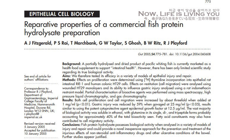 녹색 배경:태평양 연안 어류의 가수 분해 건조 제품은 현재”장 건강”을 지원하는 건강 식품 보조제로서 판매되고 있다. 그러나 실제 생물학적 활동에 관한 한정된 과학적 연구만이 존재했다. 목적:그래서 우리는 상피 손상 및 복원의 다양한 모델에서 그 효능을 테스트했다. 방법:[3H]티미딘을 생쥐의 장내 상피 세포 RIE-1및 인간 대장 HT29세포에 첨가해서 증식 효과를 측정했다. 상처를 입은 HT29단층 및 생쥐의 인도메타신 억제 모델을 이용해서 분석한 위의 상처에 영향을 주는 능력을 이용하여 반발(세포 이동)에 대한 영향을 분석했다. 생물학적 활성제의 부분 특성 분석은 질량 등 분기, 고압 액체 크로마토 그래피 및 가스 크로마토 그래피를 사용했다. 결과:1mg/ml로 첨가했을 때 세포 증식과 이동이 함께 약 3배 증가했다(p<0.01). 25mg/ml을 위관 영양 법으로 투여했을 때 위 손상이 59% 줄고(p<0.05), 이는 강력한 세포 보호제 표피 성장 인자를 12.5μg/ml로 사용한 경우와 유사하다. 대부분의 생물학적 활성은 에탄올에 용해하고 싱글 펩티드, 데빈 펩티드, 트라이 펩티드 형태의 글루는 전체 생체 활성의 약 40%를 차지한다고 추정된다. 지방산 성분도 세포 이동 활성에 기여했을 가능성이 있다. 결론:어류 단백질 가수 분해물은 다양한 손상 및 복구 모델에서 분석할 때 생물학적 활성을 가지고, 비스테로이드 소염 진통제 및 기타의 궤양성 질환의 해로운 효과 예방 및 치료를 위한 새롭고 저렴한 방법을 제공할 수 있다. 더 많은 연구가 필요하다. 상기의 내용을 확인하기 위해서, 여러가지 실험을 설계하여 실행합니다. 가수 분해 어류 단백질 농축 물 연구를 거친 탈수 어류 가수 분해 물질인 안전은 프로파뉴ー토리션에서 기증했다. 이 제품의 원료인 퍼시픽 화이트닝 또는으로 라이크(대구의 일종)은 미국 북서 태평양과 캐나다의 브리티시 컬럼비아 해안에서 얻을 수 있다. 생선은 깨끗이 씻고 오물을 제거한 뒤 잘게 썰다. 18~20시간 발효 공정은 새긴 생선, 20%의 탈염수, 0.2%의 독점 단백질 분해 효소 항세뉴라(Hansenula)효모 배양과 관련하고, 10%의 발효성 탄수화물(당으로)를 필요로 한다. 발효 후 로즈마리의 0.2%오래오래진이 산화 방지제로 첨가된 지질을 안정화시킨다. 발효액을 80℃에서 20분간 저온 살균하고 마지막에 분무 건조하고 미세한 분말을 얻는다. 어류 단백질 가수 분해물은 75~80%단백질 성분(60%펩티드 및 아미노산;미국 펜실베이니아 주 킹 아부 프로이센의 텍타ー겡에서 수집된 데이터)을 포함한다. 이 제품의 주요 아미노산 성분은 글루타민(합계 약 14~16%), 아스파라긴(10%)및 라이 싱(10%)(미국 테네시 주 멤피스 소재의 유로 피은즈에서 얻은 데이터)이다. 갈래 연쇄 아미노산(라이신, 류신 및 이소류신)의 총 기여도는 전체 아미노산 함량이 23%를 차지한다. 이 제품은 또 약 20%의 포화 지방산(주로 16:0), 40%의 단일 불포화(16:1n-7및 18:1n-9)및 40%의 다중 불포화(20:5n-3,22:6n-3)지방산 및 저농도의 인지질(미국 사우스 캐롤라이나 주 찰스턴 소재의 내셔널 마린 피셔 댓글 서비스에서 얻은 데이터)를 포함한다. 연구 시리즈 A:어류 단백질 가수 분해물이 생체외 모델(in vitro)의 복구에 미치는 영향 방법에 대한 배경 조직 세포에 손상을 받은 뒤 처음에 일어나는 생물학적 치료 반응의 하나는 부상으로 무결의 영역에서 살아남은 세포가 표피 완전성을 재정립하는 것이다(역아 달리기:손상을 받은 세포가 손상을 받은 세포로 이동하는 것). 인간이나 동물의 장기 조직에서 이러한 효과를 연구하는 것은 매우 어렵기 때문에 세포 배양 모델은 일반적으로 이 자극적 반응의 대용 마커로 사용된다(역아 달리기:invivo가 어렵기 때문 invitro로 의미). 손상이 발생해서 약 24시간 후에도 정상적 점막을 재정립하기 위해서 세포 분열 속도가 증가한다. 세포 배양 모델은 전통적으로 이 증식 만번의 대리 업체로 사용되고 있어 티미딘은 DNA의 천연 성분이기 때문에[3H]티미딘 도입은 일반적으로 증식의 지표로 사용된다. 그러므로 적극적으로 분열하는 세포는 세포 분열의 준비 상태에서 티미딘의 섭취를 증가시킨다. 연구 B:invitro의 산/후에프싱의 어류 단백질 가수 분해물의 생체 활성 안전성 방법의 배경 제품이 시험 관내에서 세포에 대해서 생물학적 활성을 가지는 것이 밝혀져도 섭취했을 때 위산 및 단백질 분해 효소의 가혹한 환경과 접촉하고 부분적 또는 전체적으로 활성을 파괴할 수 있음을 기억하는 것이 중요하다. 이 가능성을 시험하기 위해서 생체 활성 인자를 세포 이동 분석에서 후속 분석에 앞서고 위에서 발견된 조건을 모방하고 예비 배양했다. 연구 C:어류 단백질 가수 분해물이 쥐의 생체 내(in vivo)위 손상 모델에 미치는 영향 방법의 배경 세포 배양 연구가 잠재적인 생체 활성에 관한 중요한 정보를 제공하지만 상체 내의 상황(in vivo)에 대한 연구를 확장하고 추가 정보를 얻을 수도 있다. 그러므로, 인도메타신과 스트레스에 영향을 받은 쥐의 위산 손상을 예방하기 위한 어류 단백질 가수 분해물의 능력을 잘 검증된 모델을 사용하고 평가했다. 연구 D:어류 단백질 가수 분해물 내의 활성 성분 조사 방법의 배경 어류 단백
