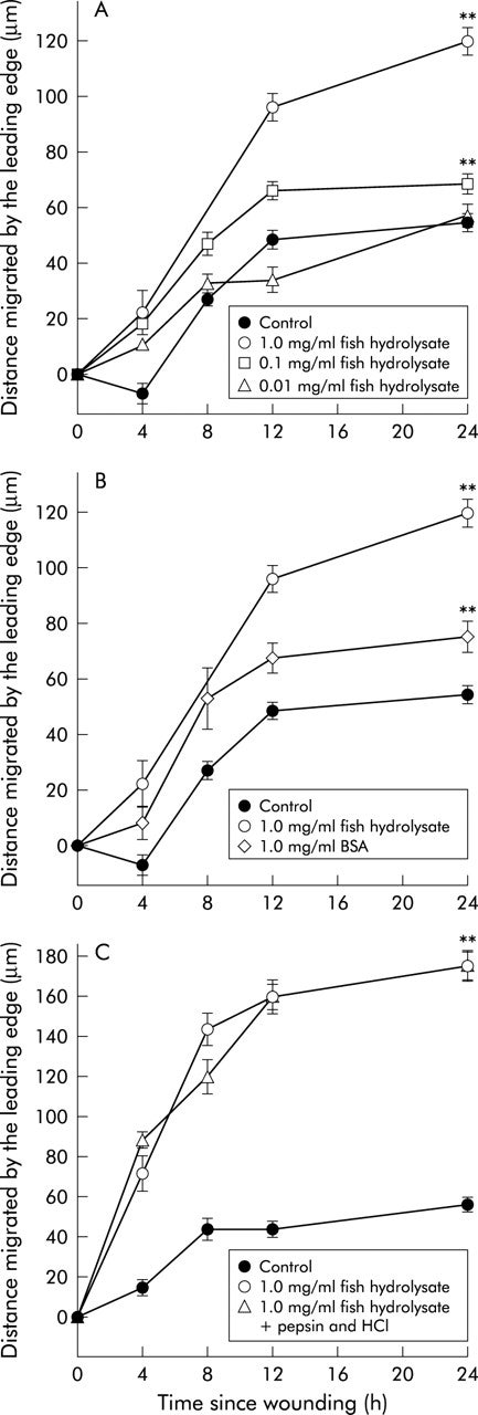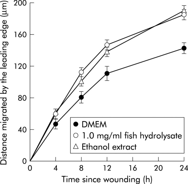 어류 단백질 가수 분해물이 위의 손상에 미치는 영향. 쥐를 대조군 용액(0.2mg/ml소 혈청 알부민(BSA)을 포함한 식염수)2ml과 5mg/ml및 25mg/ml의 어류 당화액 또는 12.5μg/ml의 표피 성장 인자(EGF, 양성 대조군)에서 위관 영양 법을 시행했다. 추가 그룹은 어류 가수 분해물의 비특이적 효과에서 특이성을 결정하기 위해서 25mg/ml의 BSA을 투여됐다. 생쥐에게 인도메타신(20mg/kg피하 주사)을 주사하고, 구속 케이지에 넣었다. 3시간 만에 동물을 사멸시키고 거시적(A)및 현미경적(B)의 정도를 판정했다. 데이터는 그룹당 n=7~12의 평균(SEM)로 나타냈다. *어류 가수 분해물, EGF또는 BSA가 제공되지 않은 대조군 동물에 비해서 p<0.05**p<0.01. 연구 D:어류 단백질 가수 분해물 내의 활성 성분 조사 어류 단백질 가수 분해물의 에탄올 추출이 세포 이동에 미치는 영향. 전염성 있는 영향에 의해서 결정된 대다수의 생물학적 활성은 에탄올에 용해했다. 전형적인 결과는 그림 4에 제시되어 있다. 여러 연구 결과에 따르면 절대 에탄올로 3시간 어류 가수 분해물을 항온 처리하면 약 73%의 활성이 에탄올에 이동하는(데이터에는 표시되지 않는다). 그림 4