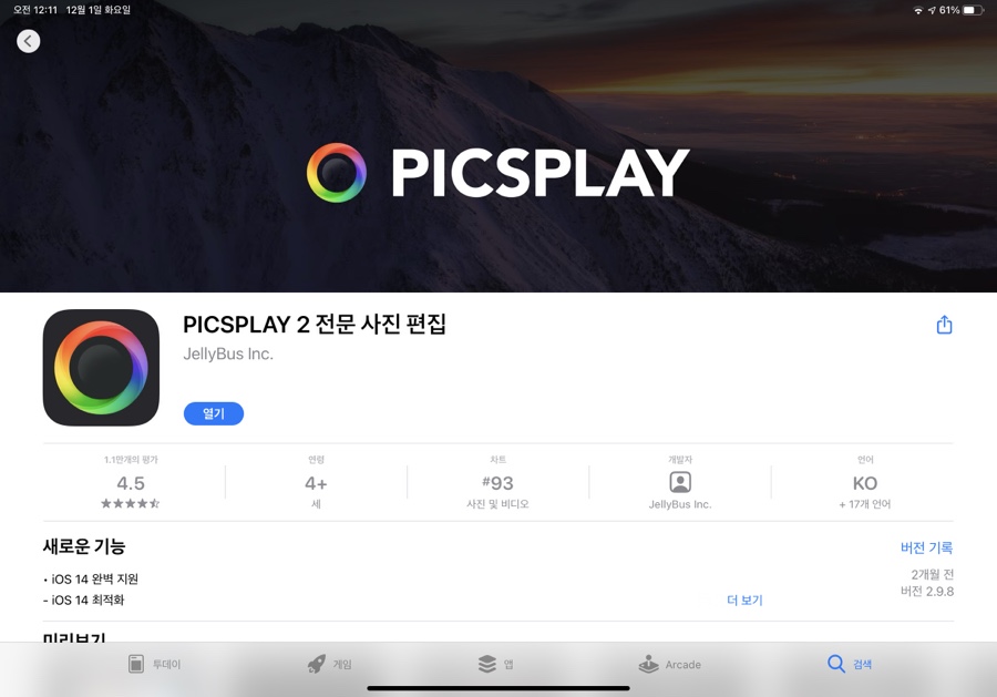 5. Picsplay 사진 편집 앱인데 정말 다양한 기능을 갖추고 있다. 아이폰만 사용한 뒤 꾸준히 사용하고 있다. 단순히 필터를 입히는 것 뿐만 아니라 간단한 성형, 다양한 효과, 상세한 레벨 조절이 가능하다. 사진편집 도구로 아이패드에서 Light room도 전문가들이 많이 사용하고 편집하는데 Picsplay는 구독형이 아닌 결제 한 번만 하면 1년 동안 사용할 수 있어 훨씬 저렴하다.