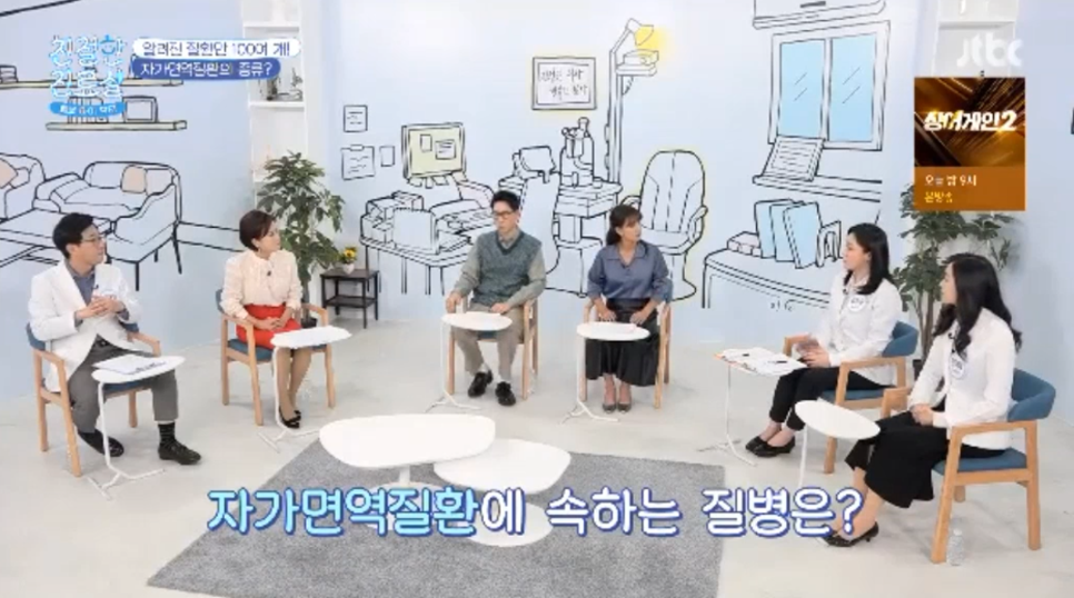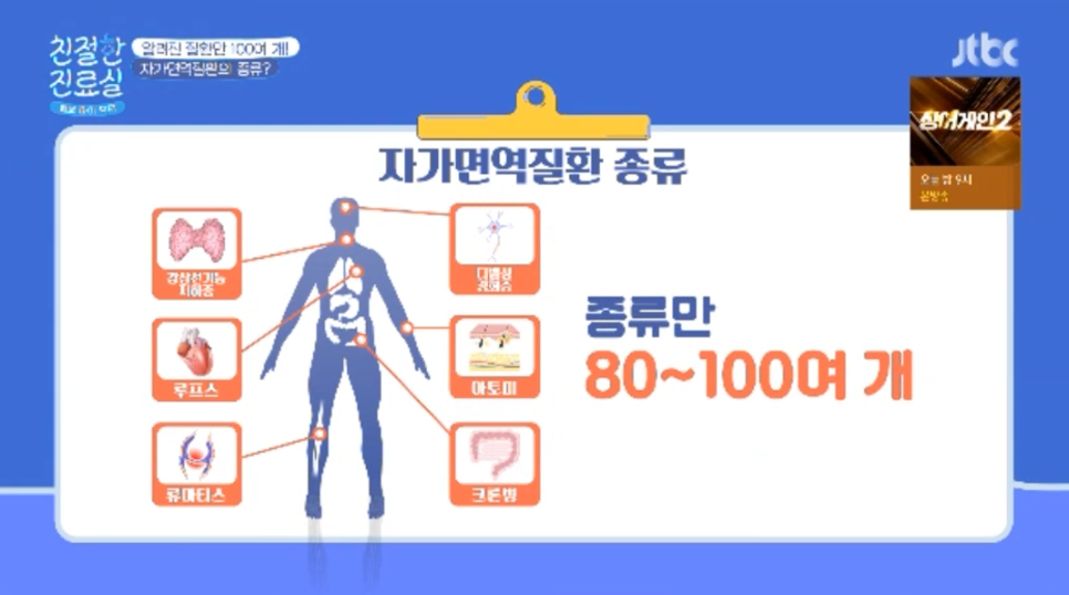 대표적인 것은 갑상선 기능 저하증, 아토피, 루푸스, 크롬병, 다발성경화증, 류머티스 등을 비롯하여 80~100개의 질환이 있습니다.