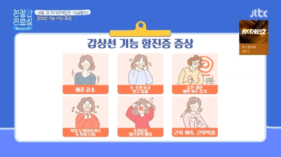 - 갑상선기능항진증 갑상선기능항진증은 갑자기 체중이 빠지는 경우가 많으며 눈이 돌출되거나 목이 굵어지거나 돌출되는 경우가 있으며 가려워지거나 머리카락이 갑자기 많이 빠져 근육이 위축되거나 근육력증이 생기는 것이 특징적인 증상 중 하나입니다.갱년기 증상도 힘들지만, 또한 이 증상이 나타나면 갑상선 검사도 함께 받는 것이 좋습니다.