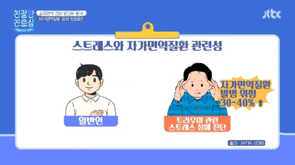 트라우마와 관련하여 스트레스 장애 진단을 받은 사람은 자가면역질환 발병 위험이 30~40% 높은 것으로 나타났으니 반드시 스트레스 관리를 해야 합니다.