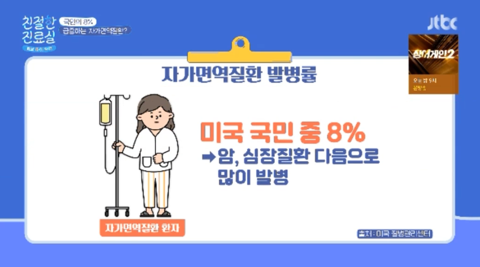 예전에는 희귀 질환이었지만 요즘은 크게 급증하고 있는데 미국에서는 국민의 8%가 자가면역질환으로 암 심장질환 다음으로 많은 분들이 앓고 있습니다.