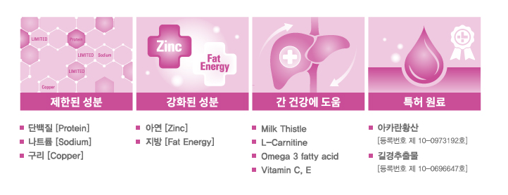 간세포를 재생하여 간기능 회복에 효과적이며 세포 내 독성물질이 들어가는 것을 방지하는 밀크시슬 함유 독성물질 해독에 도움을 주는 차전자피 함유 높은 소화흡수율로 대변량 감소, 냄새개선건 사료 대비 식수량을 7배 이상 충족할 수 있는 수의사와 영양사가 공동 개발하여 건강과 영양 균형을 맞춘 화식