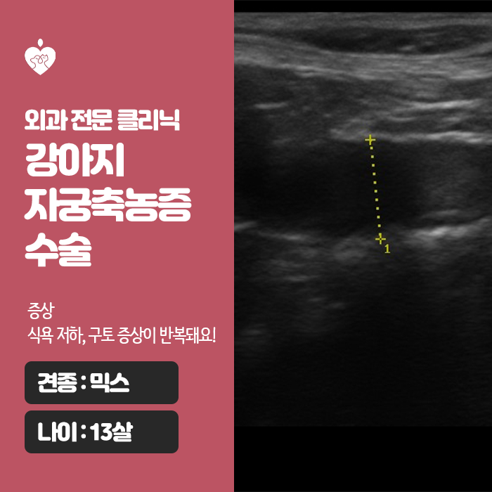 안녕하세요. 이웃입니다.수원 정자동 동물병원의 당신 말입니다. 일상 바쁘신 와중에 매번 찾아주셔서 감사합니다. 시간을 쪼개서 글을 읽어주시니까 더 도움이 될 수 있는 여러가지 정보를 가져오도록 하겠습니다. 오늘 여러분께 말씀드릴 것은 13세의 노령 아이가 식욕 저하와 구토 증상을 보이고 내원하여 개의 자궁 축농증으로 진단받아 수술까지 받게 된 이야기를 들려드리겠습니다. 함께 보시죠.내원 경로 13세의 믹스 아이가 며칠 전부터 식욕을 잃고 반복적인 구토 증상을 보여서, 긴급하게 당신에게 내원하게 되었습니다. 내원 당시 아이는 활력이 상당히 저하되어 있고, 아직 중성화되지 않은 상태로 확인되었습니다만. 혈액검사상으로는 염증수치가 올라가고 있고 초음파검사상으로는 자궁이 확장되어 있어 염증성 삼출물까지 확인되어 자궁축농증을 진단, 보호자와 상담후 바로 수술을 받기로 하였습니다.