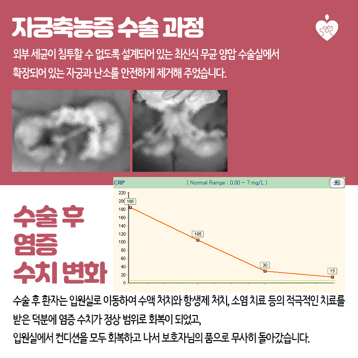 자궁축농증 수술 과정의 안전한 마취와 함께 외부 세균이 수술실 안으로 들어가지 못하도록 설계된 최신식 무균 양압 수술실로 이동하여 수술을 받게 되었습니다. 확장된 자궁과 난소를 안전하게 제거한 후 항균, 항바이러스 & 24시간 산소공급 시스템이 가동되는 위생적인 입원실로 이동하여 수액처치와 항생제 처치, 소염치료 등의 적극적인 치료를 받은 덕분에 염증수치가 정상범위로 회복되어 무사히 퇴원할 수 있게 되었습니다.