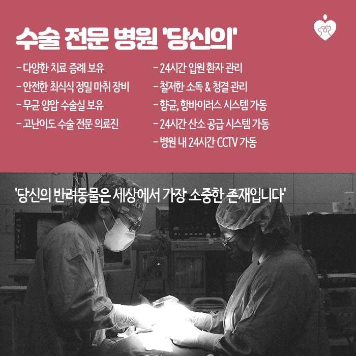 수술전문병원 ‘당신의’ 수원정자동동물병원 당신은 수술전문병원입니다 당신의 애완동물은 세상에서 가장 소중한 존재입니다라는 원훈을 잊지 않고 기억하며 늘 최선을 다해 아픈 어린이들을 치료하고 있습니다. 다양한 치료 증례를 가진 귀하는 안전한 최신식 진짜 마취 장비와 함께 무균 양압 수술실 등의 최신식 검사, 수술 장비 및 시설을 보유하고 있으며, 고난도의 수술 전문 의료진이 보다 신속하고 안전한 수술을 제공하고 있습니다.