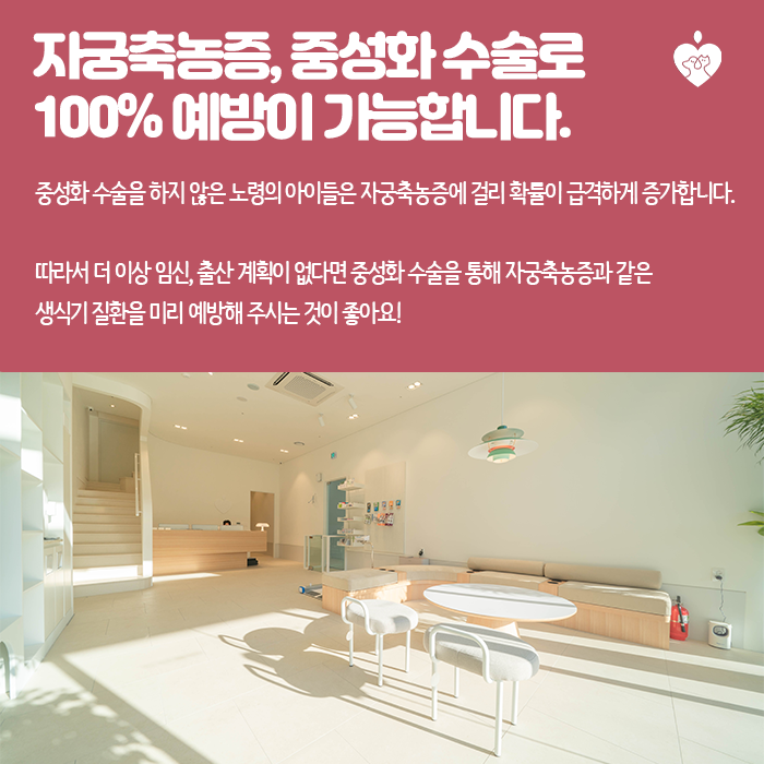 자궁축농증, 예방방법은?자궁에 염증이 생기는 것을 말하는 자궁축농증은 중성화 수술로 100% 예방할 수 있습니다. 생각보다 이 사실을 모르는 학부모 분들이 많아요. 중성화 수술을 하지 않은 고령의 아이들은 자궁 축농증에 걸릴 확률이 급격히 높아집니다. 따라서 더 이상 임신이나 출산이 예정되지 않은 상태라면 수술을 통해 자궁축농증과 같은 다양한 생식기 질환을 예방하는 것이 좋습니다. 꼭 기억해주세요!