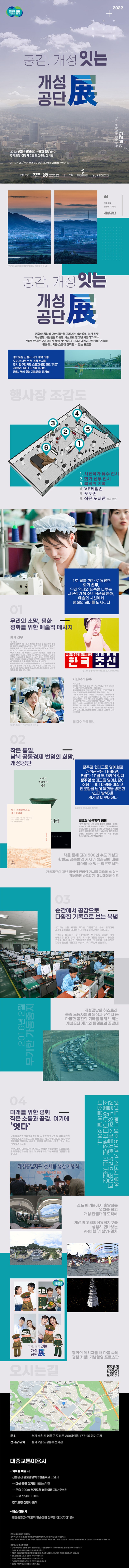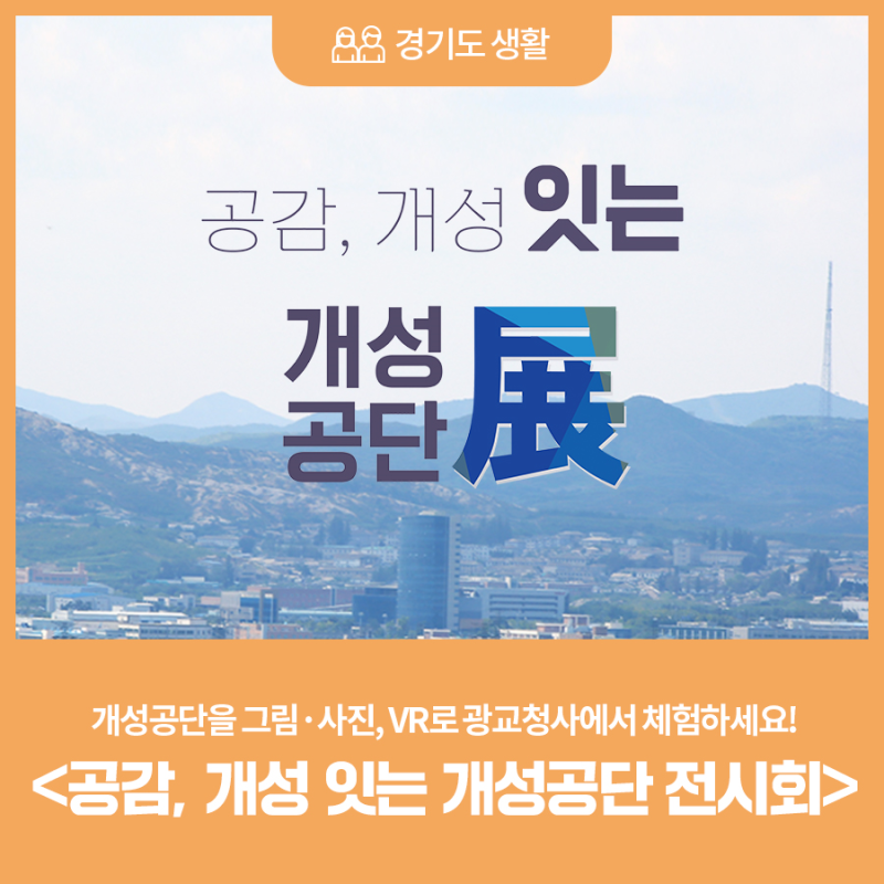 ‘제1호 탈북화가’로 유명한 화가 ‘성무’와 한국의 역사와 민족을 다루는 사진가 ‘유수’의 작품을 통해 예술의 시선에서 평화의 의미를 되새깁니다.성무 작가는 개성공단 노동자들의 미소, 평화에 대한 희망, 고향을 떠나온 이후 견뎌온 치열한 삶, 남과 북이 함께 손을 잡고 나아가는 모습 등 평화통일의 간절한 바람을 담은 작품 등 20점을 선보일 예정입니다.유수의 작가들은 개성공단 남북 노동자들의 일상 사진 30여 점을 선보이는데, 관람객들은 이를 통해 ‘사람’과 ‘소통’의 의미에 대해 생각해 볼 수 있을 것입니다.2016년 2월부터 무기한 가동 중단된 이후 현재까지 재개 여부가 논의되고 있는 개성공단. 개성공단 히스토리, 북측 노동자들의 일상과 유적지 등 다양한 공간의 기록을 통해 느끼는 개성공단 재개와 통일로의 공감을 느껴보세요!가상현실(VR) 기기로 김포 애기봉에서 출발하는 열차를 타고 개성 만월대에 도착해 개성 고려황성유적지구 등 옛 고려유적을 생생하게 탐험하는 ‘개성VR열차’ 등 다채로운 체험행사도 놓치지 마세요!공감 개성 잇는 개성공단전 행사 개요작은 통일공간이었던 개성공단의 가치를 재조명하는 <공감 개성공단 전시회>가 경기도청 광교청사에서 9월 19일부터 28일까지 개최됩니다!광교청사로 이전한 이후 첫 전시회인데, 북한 출신 화가 성무와 사진작가 유수 등이 참여하며 개성역사유적지 VR 체험, 작은 도서관, 먹거리 체험 코너 등도 운영됩니다.개막일인 19일에는 도의회 경기마루에서 개성공단 기업생산품 판촉행사도 열리는데 남북 공동경제발전과 한반도 번영의 희망을 나누는 기회가 될 <공감 개성공단 전시회>에 대해 자세히 안내해 드립니다.경기도청 경기도 수원시 영통구 도청로 30통행로가 2곳에서 4곳으로 확대되어 경기도 청사 방문이 더욱 편리해집니다!지난 5월 말 경기도청이 광교 신청사로 공식 이전을 마쳤습니다. 다만, 주변에서 대형공사가 진행되고 있기 때문에…blog.naver.com경기도 개성공단 입주기업 국내생산품 판촉행사미래를 위한 평화 작은 소통과 공감, 여기에 ‘잇다’기간 9월 19일(월) 장소 경기도의회 경기마루(1층)(경기도 수원시 영통구 도청로 30) 내용의류·식품·문구·소비재 등 도내 개성공단 입주기업의 생산품 체험 및 구매 주최/주관 경기도/(재)경기도경제과학진흥원▼경기도청 신청사 접근방법 안내 ▼작은 통일, 남북 공동경제 번영의 희망, 개성공단기간 9월 19일(월)~9월 28일(수) [10일간] 장소 경기도청 신청사 도정홍보전시관(2층)(경기도 수원시 영통구 도청로 30) 내용 남북의 작은 통일공간이었던 개성공단의 의미와 가치 재조명 사진작가 유수, 화가 선무작품 전시 개성열차 VR 체험 옛 개성의 모습과 개성공단 일상기록 포토존 등을 주최/주관 경기아트센터