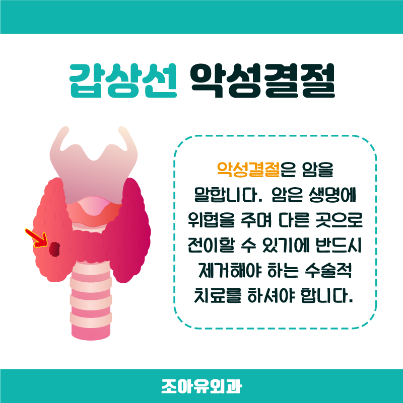 악성결절은 반대로 갑상선암을 말합니다. 말씀드리지 않아도 아시겠지만 갑상선암은 생명에 위협을 주고 다른 곳으로 전이될 수 있기 때문에 반드시 제거해야 하는 수술적 치료를 해야 합니다.