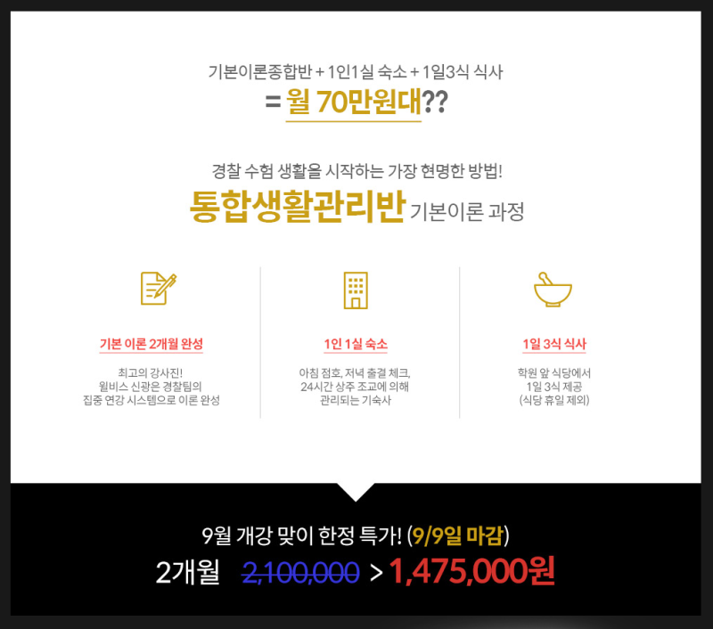 신광웅 경찰통합생활관리반은 지방수험생이지만 노량진에서 공부할 계획이 있으신 분, 노량진에서 숙식을 해결해야 해서 경찰기숙학원을 찾으시는 분, 이동시간이 많아 학습시간을 확보하기 어려운 수험생, 자기관리를 못해 어려움을 겪는 수험생, 최소한의 비용으로 합리적인 공부를 하고 싶은 수험생, 마지막이라고 생각하고 전력을 다하는 수험생에게 추천합니다.