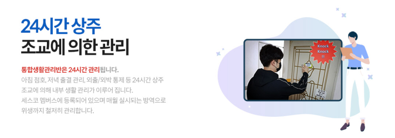 경찰기숙학교로 통합생활관리반은 최적의 형태라고 할 수 있습니다. 숙소는 24시간 상주 조교에 의해 관리되며 아침 점호, 저녁 귀가 체크, 벌점에 따른 내부생활관리가 이루어지는 통합생활관리반은 경찰기숙학원을 알아보는 수험생들이 최대의 효율로 공부하여 빠르게 합격할 수 있도록 지원합니다. 경찰 기숙학교를 알아보는 수험생들은 1인 1실인지, 검증된 교수진의 강의를 듣는지, 가격이 합리적인지, 관리가 제대로 되고 있는지 꼼꼼히 확인해야 합니다.