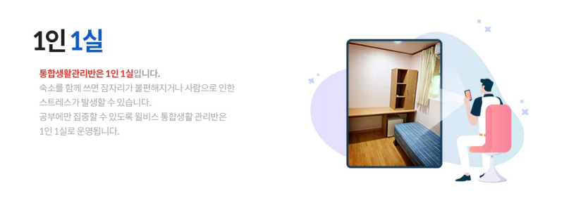 비교할수록 자신 있는 통합생활관리반은 1인 1실을 제공하고 검증된 교수진인 신광은 경찰 교수진의 강의를 제공합니다. 통합생활관리반은 합리적인 비용으로 경찰 기숙학교를 알아보는 수험생과 부모님의 부담을 확실히 줄였습니다. 수업이 끝난 후에도 지정좌석 자습실에서 부족한 부분을 공부할 수 있으며, 주 1회 모의고사를 통해 자신의 현재 위치를 꾸준히 파악하고 응시 전략을 세울 수 있습니다.
