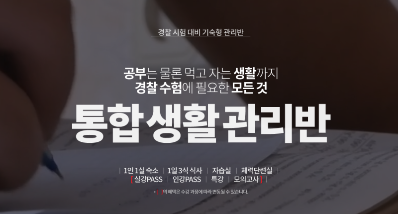 합격에 필요한 가장 핵심적인 강의 퀄리티가 보장되기 때문입니다. 경찰 기숙학교를 알아보고 있는 수험생들이 가장 먼저 생각해야 할 것이 합격을 위한 강의입니다. 통합생활관리반은 많은 경찰 수험생들이 찾는 유명 경찰학원 윌비스 신광은 경찰 교수진 강의를 제공합니다. 수식어가 필요 없는 유명 교수진 신광은 경찰팀 수업을 들을 수 있다는 점이 통합생활관리반의 강점입니다.