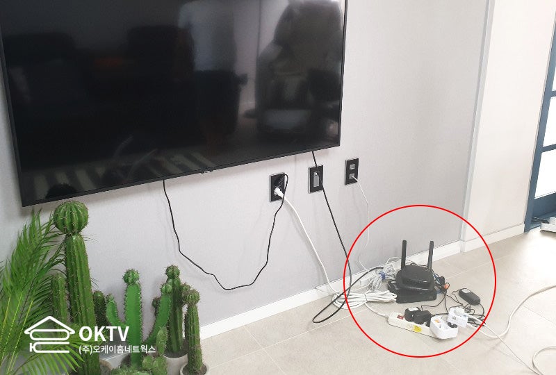 고정된 브래킷 위에는 멀티탭을 설치하여 전원 코드를 정리했습니다. 고양 벽걸이TV를 설치받아도 전원코드를 분리하거나 켤 수 있도록 쾌적한 위치로 선정하여 정돈할 수 있습니다. 라우터는 클립형 셋토버를 이용하여 고정했습니다. 클립형 셋트바에서 작업하면 장비를 교체하거나 유지보수를 받을 때도 쉽게 할 수 있어 우리가 자주 이용하는 부품 중 하나입니다~