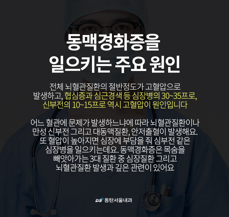 고혈압은 우리 신체의 중요 장기인 심장, 뇌, 신장, 눈을 손상시킵니다. 전체 뇌혈관 질환의 절반 정도가 고혈압 협심증 심근경색 등 심장병의 3035%, 신부전의 1015%도 고혈압이 원인입니다. 고혈압은 또한 동맥을 천천히 단단하게 만듭니다. 동맥이 딱딱해지는 병은 동맥경화증입니다. 고혈압과 동맥 경화증은 서로 영향을 미치고 악순환을 반복함으로써 혈관 상태가 악화됩니다. 어떤 혈관에 문제가 발생하느냐에 따라 뇌혈관 질환이나 만성 신부전, 대동맥 질환, 안저 출혈이 발생합니다. 또한 혈압이 높아지면 심장에 부담이 되어 심부전과 같은 심장병을 일으키게 됩니다만. 동맥경화증은 생명을 앗아가는 3대 질환 중 심장질환이나 뇌혈관질환의 발생과 깊은 관련이 있습니다. 동맥경화증을 일으키는 주요 원인인 고혈압을 치료하면 심장질환이나 뇌혈관질환의 발생 가능성을 줄일 수 있습니다. 그 뿐만 아니라 신체 마비나 치매, 심부전으로 인한 호흡 곤란 등도 예방할 수 있기 때문에, 동탄 동맥 경화에서 진찰을 받으십시오.●잘못된 습관 반드시 고쳐야
