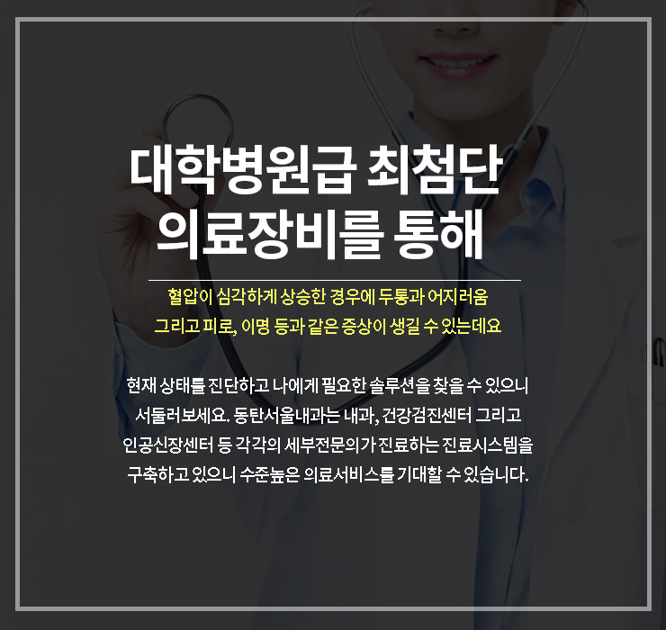 혈압이 급상승한 경우에 두통이나 어지러움, 피로, 이명 등의 증상이 나타날 수 있는데요. 고혈압은 치료와 함께 적정 혈압을 유지하면 합병증을 예방하면서 좋은 예후를 기대할 수 있으나 치료를 하지 않고 고혈압이 지속되면 합병증으로 인해 목숨을 잃을 수 있으므로 주의해야 합니다. 동맥경화에 걸리면 현재 상태를 진단하여 자신에게 필요한 솔루션을 찾을 수 있으므로 서둘러 보십시오. 동탄서울내과는 내과, 건강검진센터 그리고 인공신장센터 등 각각의 전문의가 진료하는 진료시스템을 구축하여 수준 높은 의료서비스를 받을 수 있습니다.