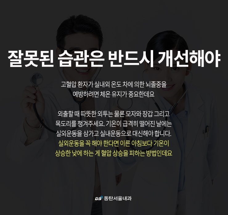 겨울에는 다른 계절보다 건강관리에 대한 관심이 더 필요한 것 같아요 그 이유는 일단 활동량이 감소하고 면역력이 약해져 기존 질병이 악화되거나 숨어있던 질병이 발현되기 때문입니다. 특히 기존의 고혈압 환자라면 더더욱 주의를 해야 할 것입니다만. 추위를 많이 받게 되면 혈관벽이 수축하게 되어 혈압이 높아지게 됩니다. 추위에 따른 혈압 상승은 활동량이 적은 밤보다 움직이는 낮에 많은데요. 특히 노인이나 마른 체형에서 자주 관찰되며 건강한 사람도 기온이 1도씩 떨어질 때마다 혈압이 0.2~0.3mmHg 오를 수 있습니다. 체온이 내려가는 것을 방지하기 위해 피부의 혈관이 수축하여 일어나는 것입니다만. 막 잠에서 깬 아침에는 더 위험해요. 겨울에는 찬바람이 불고 일교차가 심한 경우 주의해야 할 질환은 고혈압이라는 점을 명심하시고 동탄동맥경화는 동탄서울내과에서 상담해 보시기 바랍니다동맥 경화증을 일으키는 주요 원인