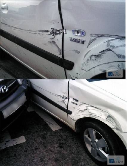 차량의 파손 장소를 근접 촬영하다.파손부위와 정도는 사고차향속도 추정에 중요한 자료