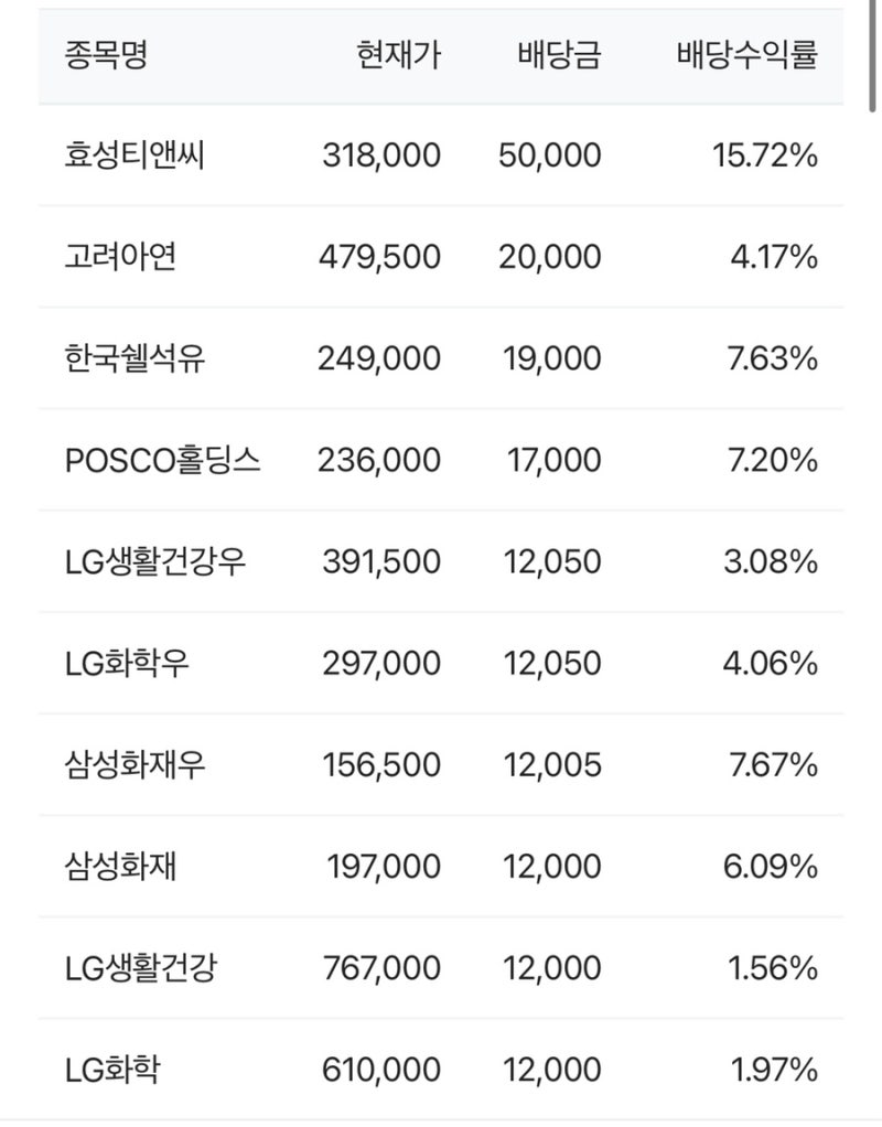 국내 배당주 순위 1. 에끌레더블 2. 바다로 19호 선박투자회사 3. 효성티앤씨 4. 동양생명보험 5. 에이치디현대 6. 한국투자금융지주 1우 7. NH투자증권 1우