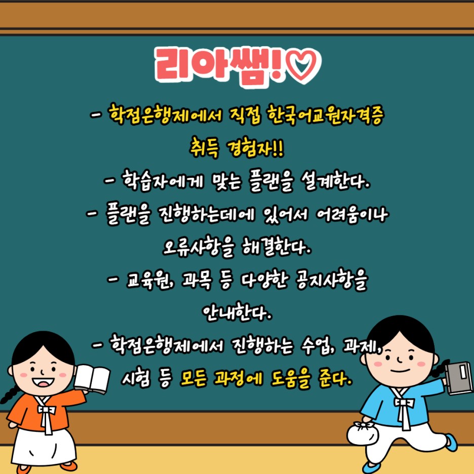 리어 선생님도 저와 함께 대학을 다니며 학점은행제 한국어 교원 자격증을 준비하여