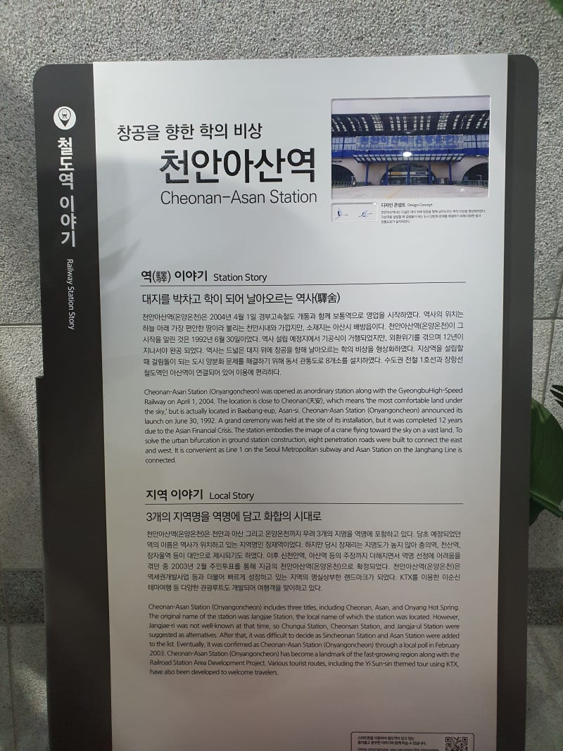 기차 여행의 재미 있는 역 이야기 천안 아산 역(온양 온천)은 2004년 4월 하루, 경부 고속 철도 개통과 함께 보통 역으로 처음 영업을 시작했다. 역사의 위치는 하늘 아래에서 가장 편한 땅으로 불리는 천안 시내에 가까운 소재지는 아산시 배방읍으로 정해졌다. 천안과 아산을 감싼 위치이기 때문에 역명도 천안과 아산의 양쪽을 포함한 천안 아산 역이 되었다. 천안 아산 역 은혜(온양 온천)이 그 시작을 알린 것은 1992년 6월 30일이었다고 한다. 역사 설립 예정지에서 기공식이 열렸지만 외환 위기를 거치면서 12년도 더 지나면 완공될 수 있었다. 역사는 넓은 대지 위로 하늘을 향해서 날아오르는 학의 비상을 형상화했다. 지상 역을 설립할 때, 걸림돌이 되는 도시 이분화 문제를 해결하기 위해서 동서 관통 도로도 8곳도 설치됐다. 수도권 전철 1호선과 장항선 철도 역인 아산 역이 연결됐으며 이용에 편리함을 더했다.