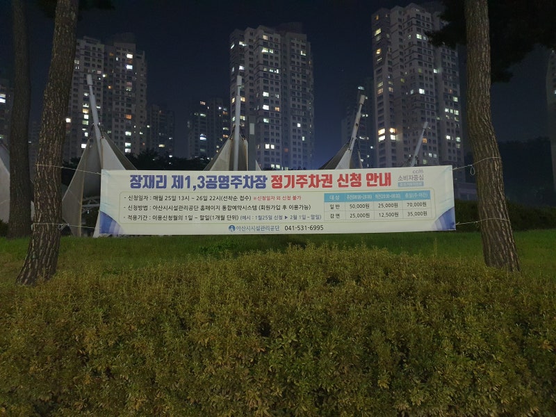 천안아산역 정기주차권 신청 상세내용.장재리 1, 3 공영주차장 정기주차권 신청은 매월 25일 13~26일 22일까지 선착순으로 접수된다. 신청일 외에는 신청이 불가능하며 신청방법은 아산시설관리공단 홈페이지 예약시스템을 통해 가능하다. 적용기간은 이용신청일 1일~말일(1개월 단위)로 이용할 수 있다. 주간권(08:00~20:00) 50,000원, 야간권(20:00~08:00) 25,000원, 종일권(주/야) 70,000원이며 감면 대상은 50% 할인이 가능하다.