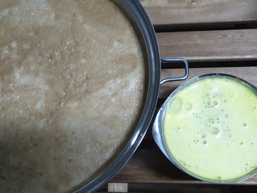 그 결과 도라지루는 옅은 황토색으로 노랗게 빛나고 사포닌 성분으로 국은 거품과 끈기를 볼 수 있습니다.그리고 도라지 향기에 취해서 작업 내내 힐링했어요