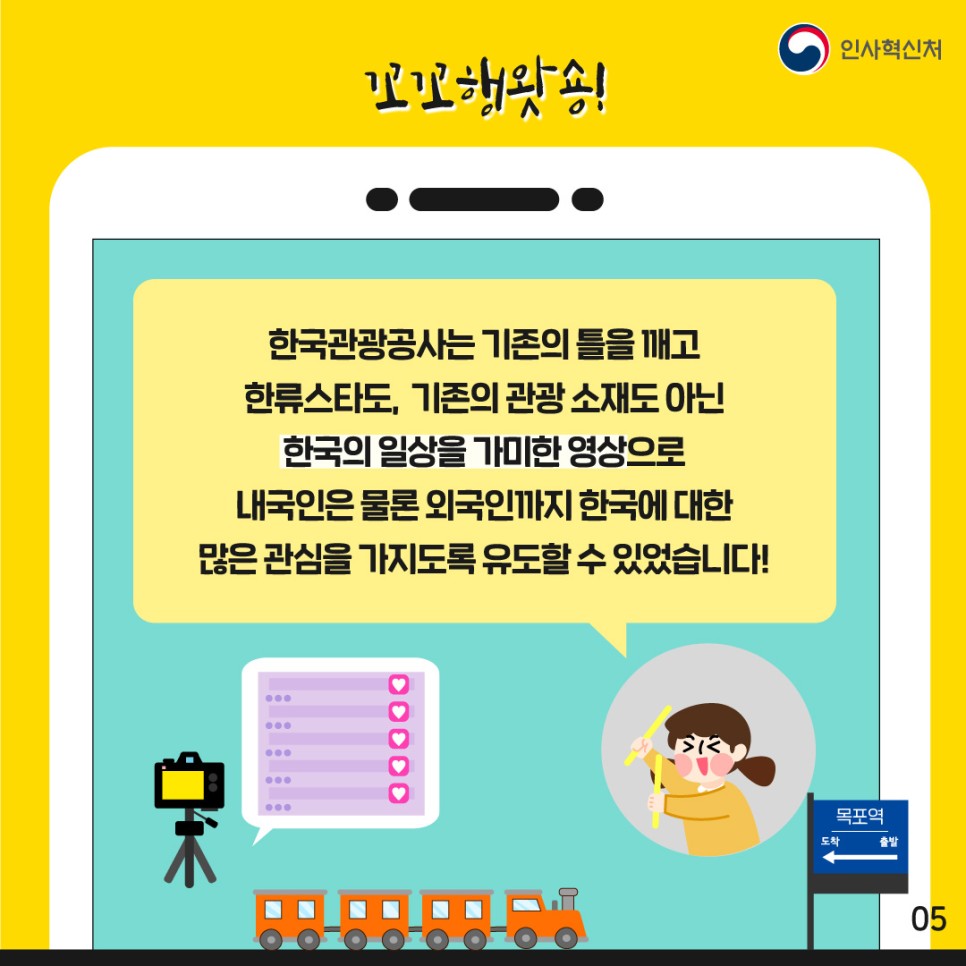 한국관광공사는 기존 틀을 깨고 한류스타도, 기존 관광소재도 아닌 한국의 일상을 가미한 영상으로 내국인은 물론 외국인들도 한국에 관심을 갖도록 유도할 수 있었습니다!