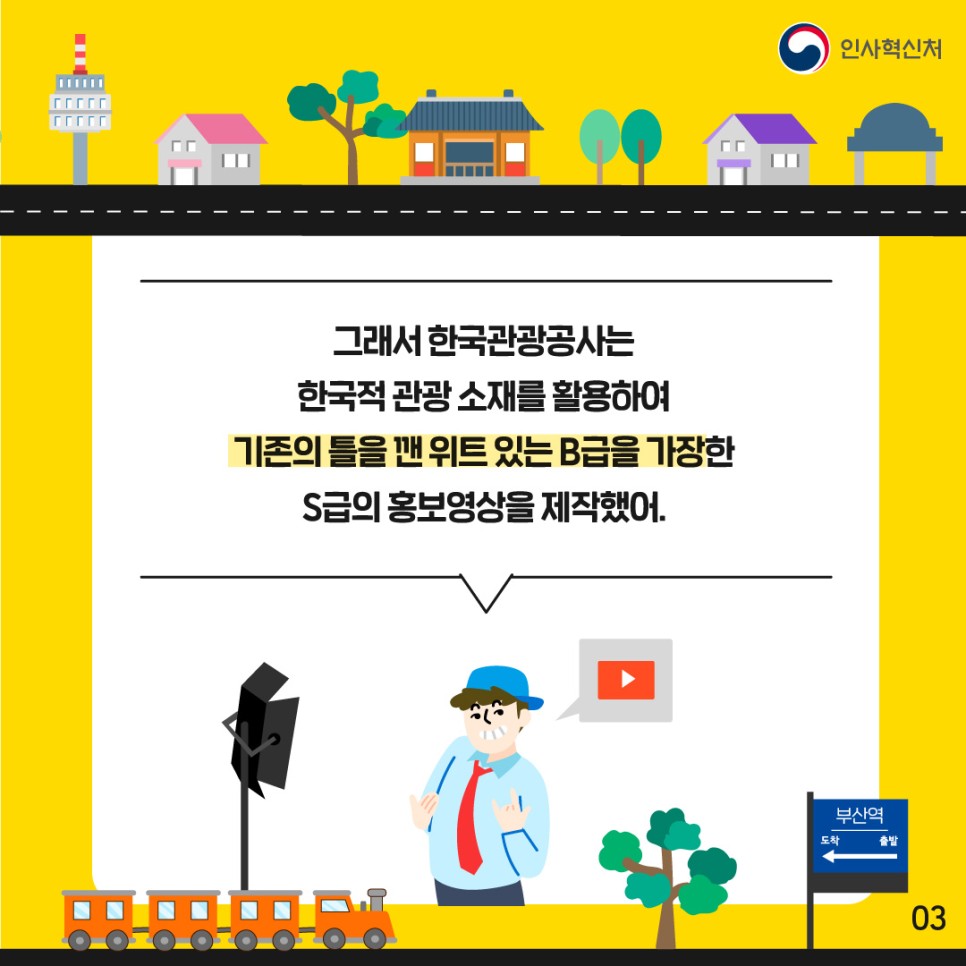 이를 위해 한국관광공사는 한국적인 관광 소재를 활용해 기존의 틀을 깬 위트 있는 B급을 가장한 S급 홍보 영상을 제작했다.